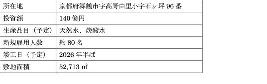 今回新設する舞鶴工場は、関西圏初の飲料水の製造物流拠点として天然水の生産設備を導入することで、災害発生時でも、関西圏を中心とした西日本の各地に飲料水などの物資を迅速かつ円滑に提供できる体制を構築できます。また、当工場が稼働することで、京都府内を中心に約80名の雇用の創出を図ります。