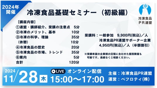 冷凍食品PR連盟株式会社(東京都港区、連盟会長:西川剛史)は冷凍食品の啓蒙活動、冷凍食品業界の活性化を目的に「冷凍食品基礎セミナー(初級編)」をオンラインにて開催いたします。冷凍食品の基礎、科学的理論、歴史的背景、市場や近年のトレンドまで、冷凍食品に関して幅広く学ぶことができ、冷凍食品関係者が最初に知るべき基礎知識を短時間(2h)で学ぶことが可能です。冷凍に関連した企業様の担当者教育にご活用ください。