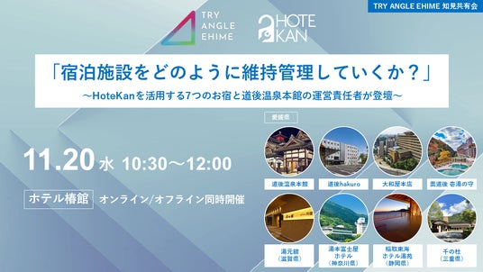 このイベントは、愛媛県のデジタル実装加速化プロジェクト「トライアングルエヒメ」の知見共有会です。HoteKanを活用し施設管理を行う道後温泉の宿泊施設や温浴施設の代表者に登壇いただき、HoteKanの使い方や修繕管理で苦労している点や工夫している修繕事例を共有いただきます。