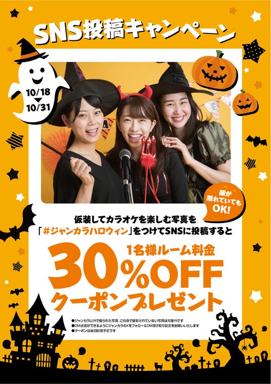 仮装してジャンカラでカラオケを楽しんでいる写真を『#ジャンカラハロウィン』のハッシュタグをつけて投稿した皆様に1名様ルーム料金30%OFFクーポンをプレゼントします。