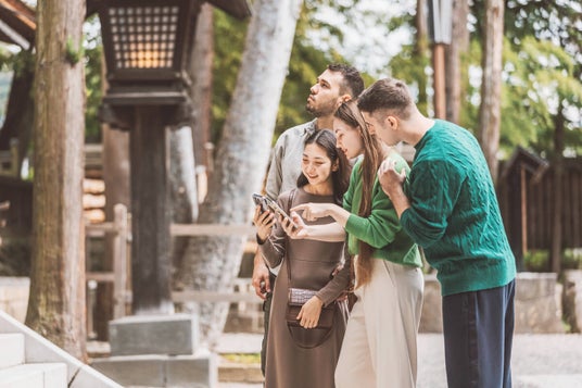 諏訪大社内専用スマートフォンアプリ「Suwa Taisha NAVI」を使用する外国人観光客
