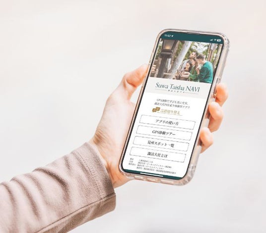 諏訪大社内専用スマートフォンアプリ「Suwa Taisha NAVI」は、アプリ上で自分の位置情報を見ながら四社内の各スポットを探索でき、現地でしかそのスポット詳細を見ることができない、GPS連動の体験型アプリとなっています。