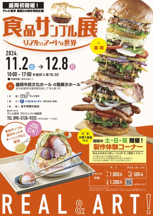 株式会社テレビ岩手(本社:岩手県盛岡市)は、テレビ岩手開局55周年特別企画として「食品サンプル展in盛岡」を岩手県盛岡市で初めて開催いたします。2024年11月2日(土)~12月8日(日)の期間中、「盛岡市民文化ホール4階展示ホール」でリアルでアートな世界を体験しませんか?