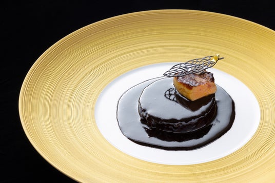 チョコレート色のソースが艶やかなジビエ・ア・ラ・ロワイヤルは、野兎、穴熊、雷鳥など、多種多様なジビエを一度に味わえる贅沢なジビエ料理です。苦みのあるジビエに甘みを合わせたり、ニンニクや玉ねぎなどと煮込んだりと、ジビエの特性に合わせて一つひとつに調理を施し、その後ファルス(混ぜ合わせる)にしています。さらにジビエのフォン(出汁)やマデラ酒、ブランデーなどで5~7日間かけてじっくりと煮込んでいます。それぞれのジビエの風味が絡み合い、ひとたび口にすれば、ジビエの醍醐味である豊かな滋味が広がるのが魅力です。