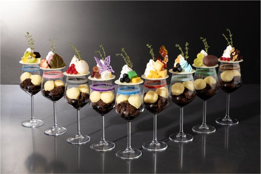 コーヒーゼリーとチョコクランチのパフェの上に、各柱をイメージしたデザートを飾っています。
