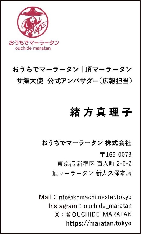 SNSマーケティング事業を行う ネクスター株式会社(本社:東京都 新宿区、代表取締役社長CEO:細田悠巨)のグループ会社である、D2Cブランド事業を行う おうちでマーラータン 株式会社(本社:東京都 新宿区、共同代表 齋藤悠)が運営するD2Cブランド『おうちでマーラータン』( https://maratan.tokyo )は、新大久保に本店を構える『 頂マーラータン 新大久保 本店 』の味をおうちで簡単に味わえるようにした冷凍麻辣湯のヘルシーD2Cブランドです。その公式アンバサダー(広報担当)として、緒方真理子が就任し、ネクスター・オフィシャル・パートナーシップ契約を締結しましたことをこちらにお知らせいたします。