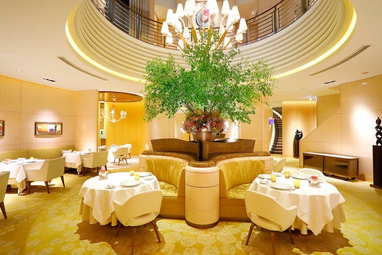 店内は「白」「ゴールド」「透明感」「ガラス」「光」をキーワードに構成されており、9メートルにもおよぶ吹き抜けと一体化したダイナミックな空間で、開放感とくつろぎに満ちた非日常の時間を満喫していただけます。サービス・ホスピタリティにおいてもスタッフの能力が発揮され、国内外の多くのお客さまから高い評価を受けています。