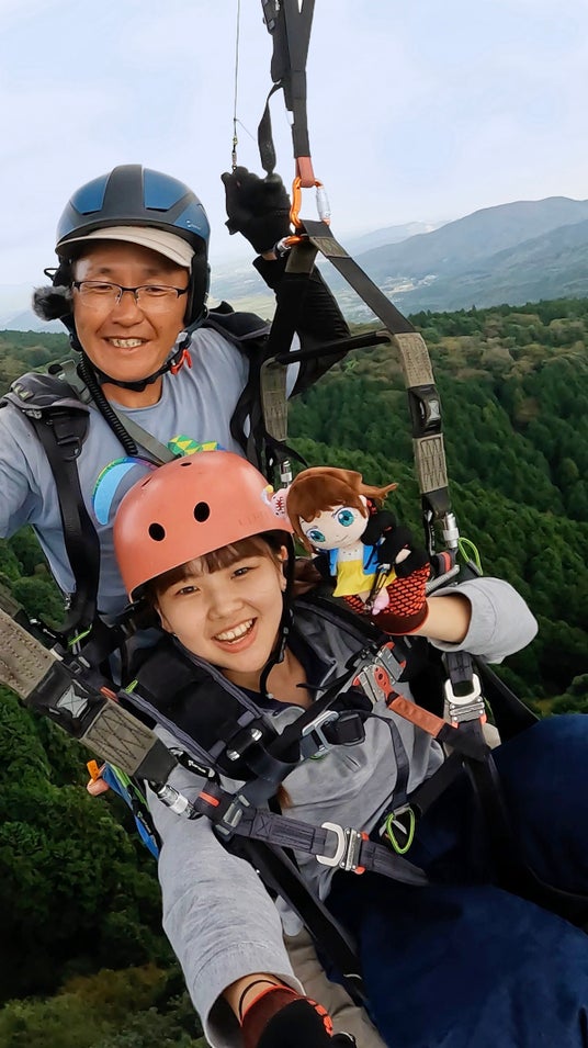 パラグライダーで推しと楽しむ「空」の絶景筑波山周辺の山麓では、太平洋から吹き込む穏やかな海風を利用してパラグライダーが盛んに行われています。風を肌で感じながら山々の上空を飛び、「推しぬい」と一緒に関東平野を一望できます。条件が揃えば東京の高層ビル群や富士山が見えるかも。タンデムフライトだから操縦は気にせず、ゆったりと景色も見れて、「推しぬい」と一緒に自撮りもできちゃう!