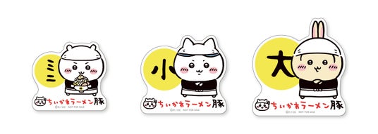 ラーメンは「ミニ(ちいかわ)」、「小(ハチワレ)」、「大(うさぎ)」3サイズから選べ、オリジナルどんぶりにてご提供いたします。ラーメンメニューをご注文された方には、特典としてオリジナルどんぶりデザインの特製ステッカーをそれぞれお渡しいたします。