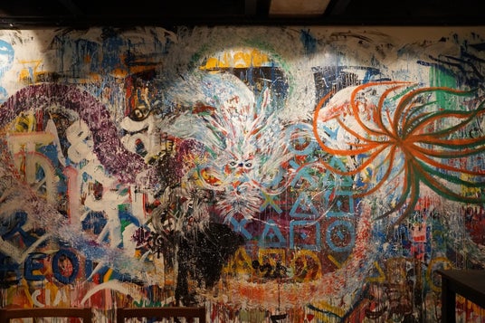 このイベントの開始直前には、会場での二人によるコラボレーションライブアート制作を3日間連続で予定していましたが、台風の影響でNANDE氏の来島が遅れ、結果的に滞在制作時間は24時間未満となりました。そんなアクシデントを乗り越え、二人のアーティストのコラボレーションが実現し、蔵元SAKE&GALLERYのウォールアートが新たな形で生まれ変わりました。