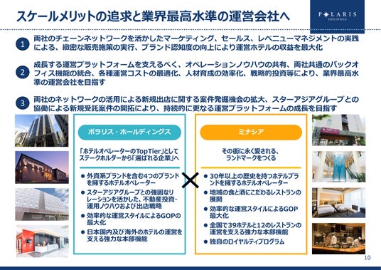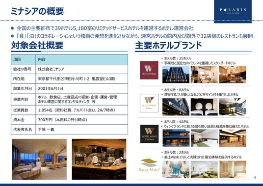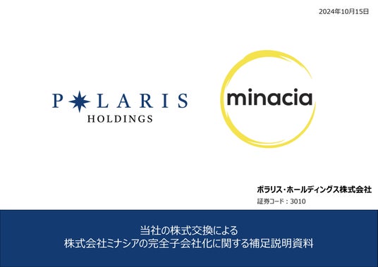 2024年10月15日、ホテル事業を主力事業としております当社(ポラリス・ホールディングス株式会社、東京都千代田区、証券コード:3010)は、全国でホテル事業を行っておりますミナシア社(株式会社ミナシア、東京都千代田区、非上場)との間で株式交換契約を締結し、ミナシア社を当社の完全子会社とすることといたしました。