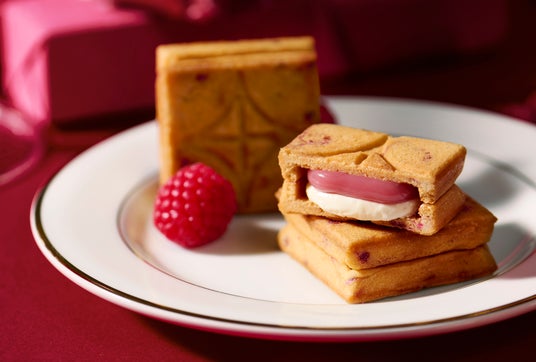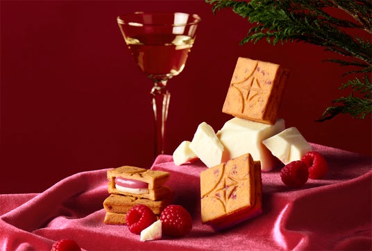 甘酸っぱくフルーティーなラズベリーキャラメルと、ミルキーで風味豊かなホワイトチョコレートを練り込んだバタークリームを、さくさく食感のクッキーで挟みました。フリーズドライのラズベリーを混ぜ込んだクッキー生地は見た目にも華やかでホリデーシーズンにぴったりです。ラズベリーをイメージしたピンクのラインと、ホワイトチョコレートをイメージした白いパッケージにキラキラとした光沢のあるシールが、ホリデーシーズンの気分を高揚させます。