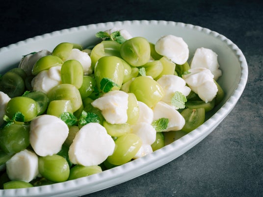 もっちりミルキーなモッツァレラと、爽やかで豊かな甘みのシャインマスカットを、ホワイトバルサミコとはちみつの甘酸っぱさがまとめるサラダ。シンプルなカプレーゼ仕立てで、フレッシュミントがアクセントに。