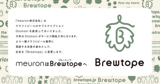 meuron株式会社(本社:東京都目黒区 代表取締役:金澤俊昌)は、クラフトビールの定期便サービスOtomoni(オトモニ)のサービス5周年の節目に、Brewtope株式会社へ社名変更いたしました。