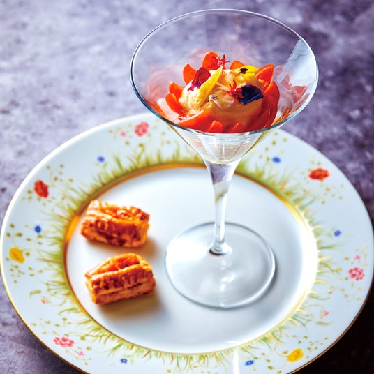 「伊勢まぐろ」や「伊勢海老」など伊勢湾、鳥羽湾で取れる魚介類を前菜、鉄板焼でお楽しみいただきます。メインとなるステーキは日本三大和牛の一つ「松阪牛」をご用意。「美し国」「御食国」と称される三重県産の食材を目の前でシェフが仕上げる妙技、焼き上げる音や立ち上る香り、熱量を感じ五感で味わう鉄板焼の醍醐味をご堪能ください。