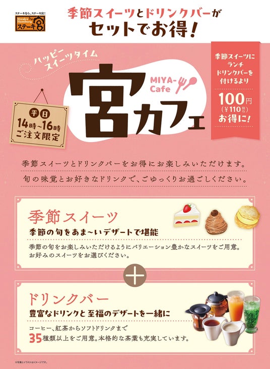 また、平日の14時~16時限定で季節のスイーツとドリンクバーをお得にお楽しみ頂ける「宮カフェ」を開始いたします。季節スイーツとドリンクバーがセットになっており、通常より100円(税込110円)お得にお楽しみ頂けます。