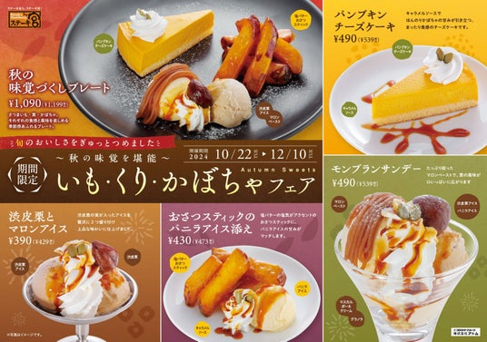 さつまいも・栗・かぼちゃを使用した、秋の味覚がたっぷり堪能できるスイーツをご用意いたしました。渋皮栗を混ぜ込んだアイス、塩バターの塩気が利いたおさつスティック、かぼちゃの甘みが引き立つチーズケーキなど秋の味わいをお楽しみ頂けます。