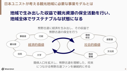 宿不足や収益の不安定さなど熊野古道の観光が抱える課題を解決するため、地域で生み出した収益で観光資源を保全し、 地域全体で持続可能な状態となることを目指していると説明。その上で、無人運営の仕組化やサプライチェーンの構築を行うことで、他にはない運営体制を実現していると紹介しました。