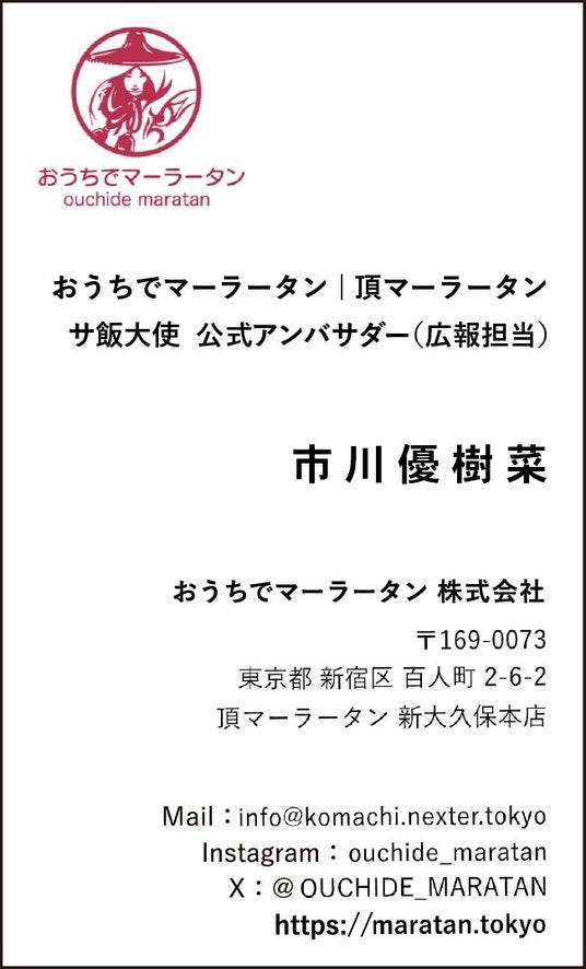 SNSマーケティング事業を行う ネクスター株式会社(本社:東京都 新宿区、代表取締役社長CEO:細田悠巨)のグループ会社である、D2Cブランド事業を行う おうちでマーラータン 株式会社(本社:東京都 新宿区、共同代表 齋藤悠)が運営するD2Cブランド『おうちでマーラータン』( https://maratan.tokyo )は、新大久保に本店を構える『 頂マーラータン 新大久保 本店 』の味をおうちで簡単に味わえるようにした冷凍麻辣湯のヘルシーD2Cブランドです。その公式アンバサダー(広報担当)として、市川優樹菜が就任し、ネクスター・オフィシャル・パートナーシップ契約を締結しましたことをこちらにお知らせいたします。
