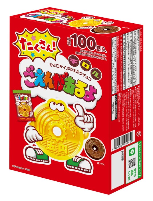 「ごえんがあるよ」は1984年に誕生した、5円玉の形をしたミルクチョコレート。パッケージのキャラクターは“ごえんくん”。発売40周年の今でも多くの人に愛される昔なつかしい商品です。