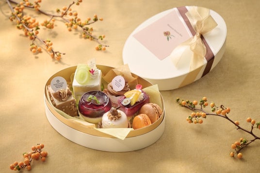 マロンスイーツを含むミニサイズのスイーツ6種とマカロン2種を詰め込んだスイーツボックスです。紅葉狩りや秋晴れのティータイムのお供にいかがでしょうか。