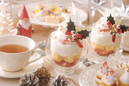 セイボリーのおすすめは、洋梨の炙りと紅茶鴨のピンチョス。みずみずしい洋梨がコクのある鴨をひきたてます。スイーツはさわやかな風味のヨーグルトとシャンティークリームがストロベリーのほどよい酸味と調和し、スプーンが止まらなくなってしまう「ホワイトクリスマスパフェ」。期間限定で提供するSIROCCO TEA「WHITE CHRISTMAS」とともにお楽しみいただけます。