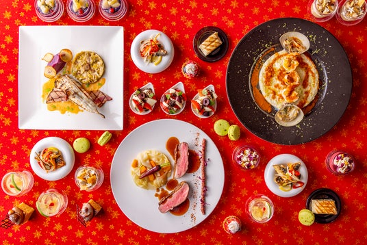アンブロシアキャビアをのせた平目のカルパッチョからスタート。パスタ料理は、京鴨胸肉のローストとスパイスカカオのソースとともにお愉しみいただくカカオ風味のラビオリを。クリスマスモチーフをあしらったロブスターテールと続き、メインディッシュには和牛フィレ肉を赤ワインソースで。ディナーの締めくくりには、オーナメントを模した純白のデザートを。特別な夜にふさわしい、豪華なラインナップでお届けします。