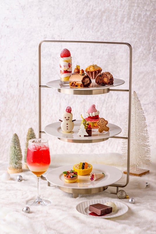 世界のクリスマススイーツが勢揃いする、フェスティブアフタヌーンティー。マロンとナッツが香るフランスのブッシュ・ド・ノエル、ドライバナナとアーモンドが詰まったドイツの伝統的なシュトーレン、ふんわりとしたクリームと甘酸っぱい苺が絶妙なバランスのショートケーキなど、ホリデースイーツが華やかに彩ります。セイボリーはアンブロシアキャビアを載せたアボカドとサーモンのタルタル、クリスマスリースに見立てたフォアグラのムースといったプレミアムな味わいのアイテムをお愉しみいただけます。