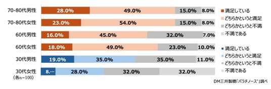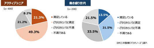 ご自身の運動や活動量に関して満足度を聞いてみたところ、アクティブシニアは7割を超える70.6%が「満足」していると回答。一方、働き盛り世代で「満足」している方は45.0%と半数にも満たず。シニア世代と比較して、「時間」も「頻度」も「金額」も、そして「満足度」も及ばない結果となりました。