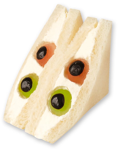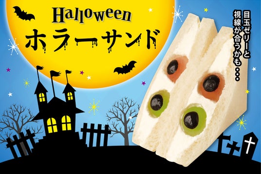 見た目がちょっと不気味な赤と緑の目玉が特徴のハロウィンホラーサンド。見た目は不気味ですが、いちごとメロン風味のゼリーで仕上げた目玉と生クリームは食べても美味しく、ハロウィン気分を盛り上げてくれること間違いなし!