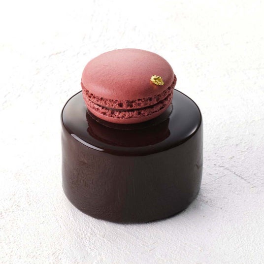 マカロンで仕上げたチェリーとショコラのケーキ。濃厚な味わいのチェリーショコラムースでチェリーのコンフィチュールとホワイトチョコレートムースを包みました。