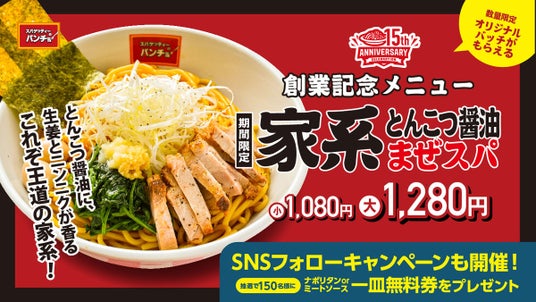 “改めてナポリタンはうまいと言わせたい”を理念に掲げる『スパゲッティーのパンチョ』は2024年11月13日(水)に創業15周年を迎えます。それを記念し創業祭を全店で開催、11月1日(金)からノベルティー付き15周年記念特別メニュー「家系とんこつ醤油まぜスパ」を期間限定で販売します。さらに抽選で150名様に一皿無料券をプレゼントする15周年SNSフォローキャンペーンも同時開催。いつも以上にパンチョを楽しめる15周年創業祭、ぜひお近くのパンチョでお楽しみください!