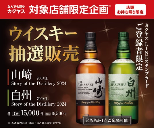 首都圏を中心に酒類等の販売、デリバリーを手掛ける株式会社カクヤス(東京都北区、代表取締役社長:佐藤順一、以下:当社)は、10月23日よりカクヤスLINEミニアプリ会員を対象に人気の国産ウイスキーである山崎、白州それぞれの限定品「山崎 Story of the Distillery 2024」、「白州 Story of the Distillery 2024」をなんでも酒やカクヤスの対象店舗限定で抽選販売します。