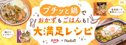 Nadia株式会社(東京都港区/代表取締役社長 葛城嘉紀 以下「Nadia」)とエバラ食品工業株式会社(神奈川県横浜市/代表取締役社長 森村 剛士 以下「エバラ食品」)がタイアップし、「プチッと鍋」の認知・消費拡大を目的に、特別企画ページ【鍋だけじゃない!プチッと鍋でおかずもごはんも!大満足レシピ】を公開いたしました。
