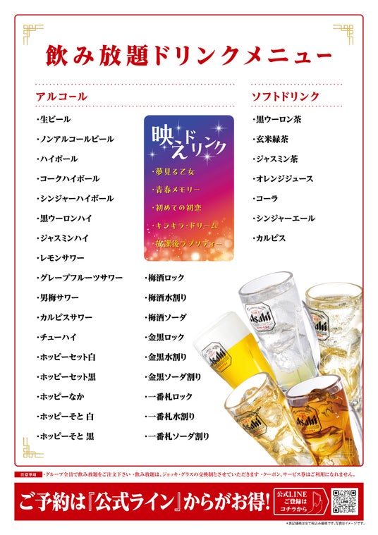 ※土日祝日はご予約は受け付けておりませんが、「食べ飲み放題プラン」は店舗にて実施しております。