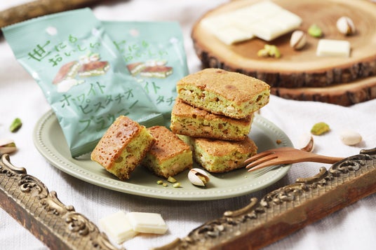 『世にもおいしいホワイトピスタチオブラウニー』は、女性に人気のピスタチオと、ホワイトチョコを掛け合わせました。ピスタチオ風味広がるブラウニー生地と、ザクザクとしたホワイトチョコチップとローストピスタチオの食感をお楽しみいただけます。