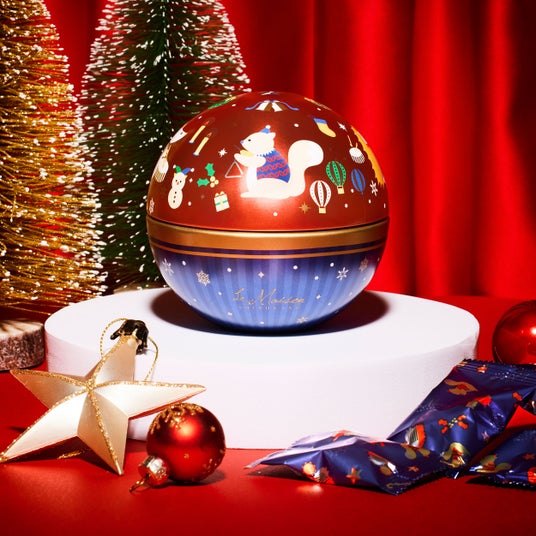 クリスマス限定フィルムに包まれたミルクチョコレートを球体缶に詰め合わせました。