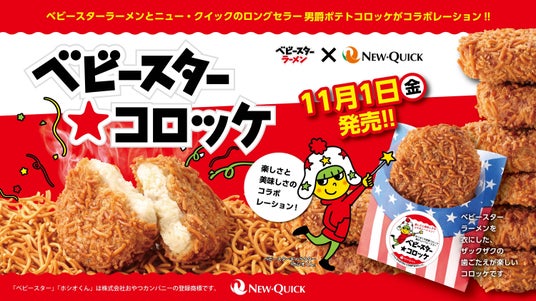 発売65周年の「#こんなとこにもベビースター」第11弾は、スナック菓子売り場を飛び出して【お肉屋】へ。全国に店舗を展開する老舗肉屋ニュー・クイック(株式会社ニュー・クイック 所在地:東京都中央区 代表取締役:林浩二)とコラボレーションした商品『ベビースター★コロッケ』を全国のニュー・クイック惣菜取り扱い店舗にて、2024年11月1日(日)より期間限定で展開されます。