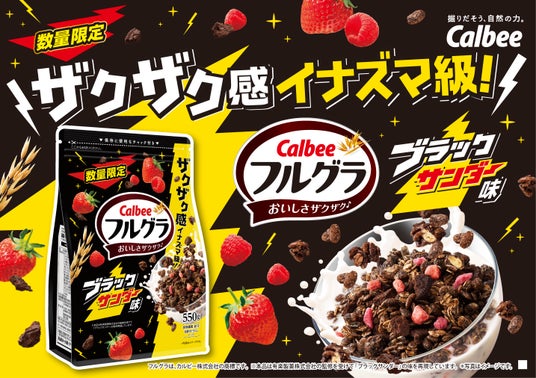 - 『フルグラ(R) ブラックサンダー味』は、有楽製菓の「ブラックサンダー」とカルビーの「フルグラ(R)」のコラボレーション商品です。ザクザク感イナズマ級の両商品のおいしい味わいを楽しむことができます。