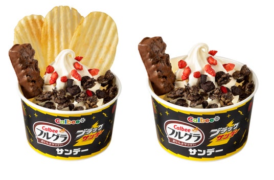 コラボレーション2年目の今年は、よりたくさんの方に「このおいしさを知っていただきたい!また、新しい食べ方でも楽しんでいただきたい!」と考え、カルビー商品を使ったできたてメニューでもおなじみの、アンテナショップ「カルビープラス」ともコラボレーションします。ソフトクリームに『フルグラ(R) ブラックサンダー味』・「ブラックサンダーミニバー」・「揚げたてポテトチップス」をのせたスペシャルなサンデーを数量限定で発売します!