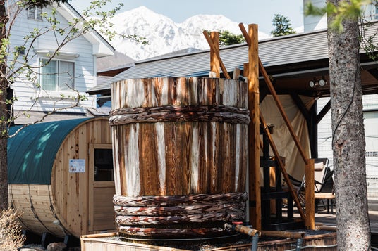 トレンドマークとなるのは、日帰りバレルサウナと利用する「2m越えの巨大醤油樽の水風呂」。明治時代から続く老舗の醤油専門店である「大門?油」さんから使わなくなり、捨てられるはずだった樽を引き継いだものです。2022年にクラウドファンディングで協力金を集め、奈良県の蔵から白馬の地まで運び、修繕をして設置したという背景があります。