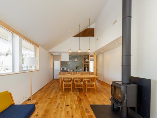 インテリアはデンマーク製のビンテージ家具とノルウェー製の薪ストーブで彩られています。最大7名までの宿泊が可能で、オープンキッチンを囲んで、一緒に料理を楽しむことも。