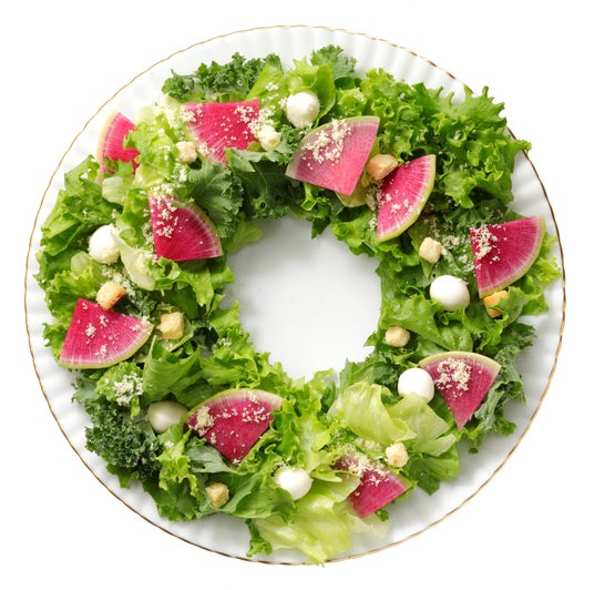 盛り付けるだけで簡単に完成するリースサラダ。紅芯大根のピンク色が鮮やかで、クリスマスの1品におすすめです。