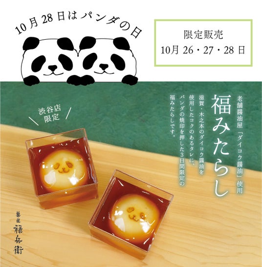 1926年(大正15年)創業の和菓子ブランドを展開する、株式会社菓匠禄兵衛(本社:滋賀県長浜市/代表取締役:居川 信彦)は、渋谷店限定で『パンダ福みたらし』を販売いたします。販売期間は、パンダの日(10月28日(月))を含む2024年10月26(土)~28(月)の3日間、個数は100個限定です。