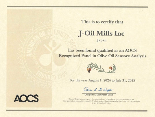 <コメント> おかげさまで今年もAOCSオリーブオイル官能評価パネルの認定をいただきました。オリーブオイルは精製工程があるサラダ油等と異なり、風味変動要因が多いため、その目利き力を高めることはとても大切です。