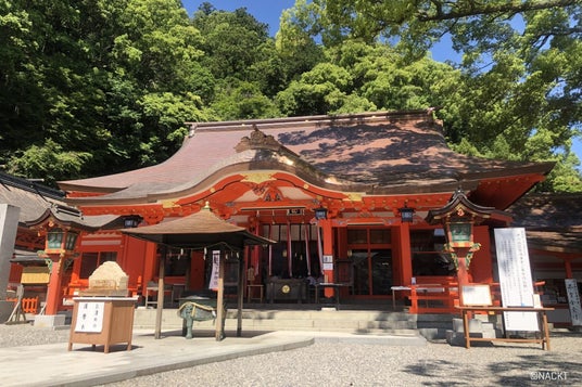 熊野那智大社は熊野三山の一社で、全国にある熊野神社の御本社です 山の緑に6棟からなる朱塗りの社殿や礼殿が映え、神聖な雰囲気が漂います