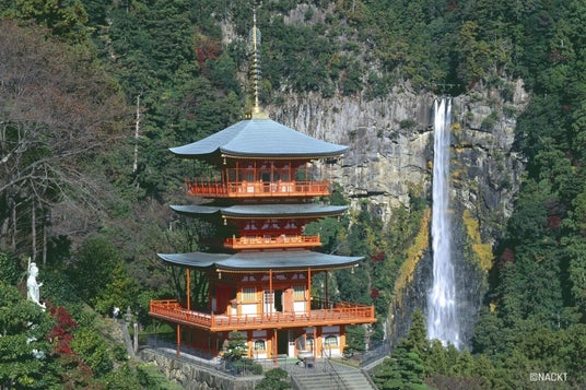 那智山青岸渡寺三重塔 那智の滝との調和が美しい朱色の三重の塔は、フォトスポットとなっています