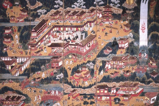那智参詣曼荼羅図には、那智山の賑やかさの一方、補陀洛渡海や応照上人、妙法山、花山法皇の33観音巡礼などの物語が描かれており、全国で「絵解き」をしながら熊野をPRしていました