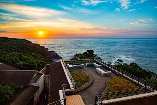 空と海のテラス:テラスからは熊野灘のパノラマビューが広がります 空には優雅にはばたく鳥の姿が、夜には満天の星や大海へと旅立つ船の灯かりが海を照らします 朝は熊野灘から昇る日の出をご覧いただけます