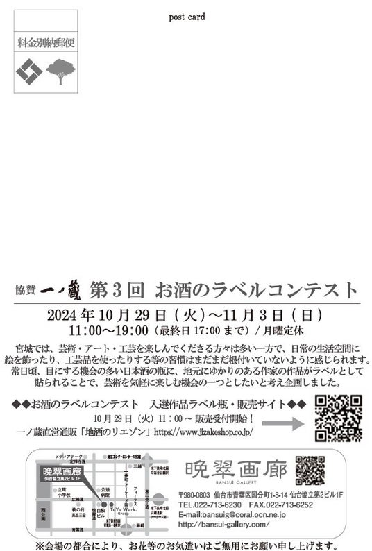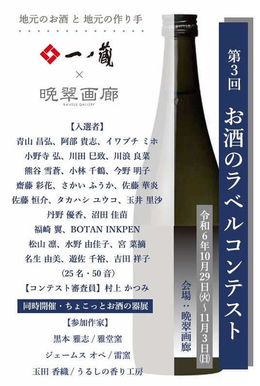 アートギャラリー 晩翠画廊(宮城県仙台市)は、2024年10月29日(火)~11月3日(日)まで「第3回 お酒のラベル コンテスト」の作品展を開催する。